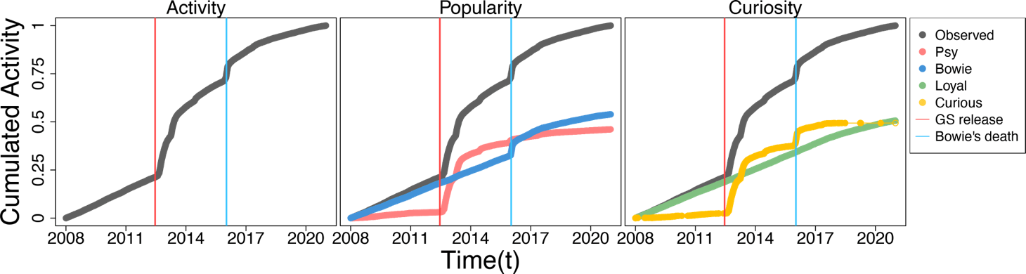 The grey curves in the above graphs show the cumulative percentage of youtube activity (only USA audience) associated with both artists from 2008 to 2020 (for details regarding data collection and preprocessing, see the referenced article). Most of the time, the rate of growth of the system activity is approximately constant. However, this linearity is sometimes broken by sudden bursts of events highlighted by the vertical red and blue lines. The first spike (vertical red line) matches with the Gangnam Style release. The hit had an unprecedented explosion of popularity and its music video “broke” the YouTube view counter's limit. The second burst of events (vertical blue line) coincides with David Bowie's unexpected death. This unfortunate exogenous event triggered the audience's curiosity and substantially increased his video views and reactions in posts and comments. In this frenzy, old fans recalled his talent by listening to his songs again, while the new generation discovered a treasure and quickly transformed into a musical and show business icon.