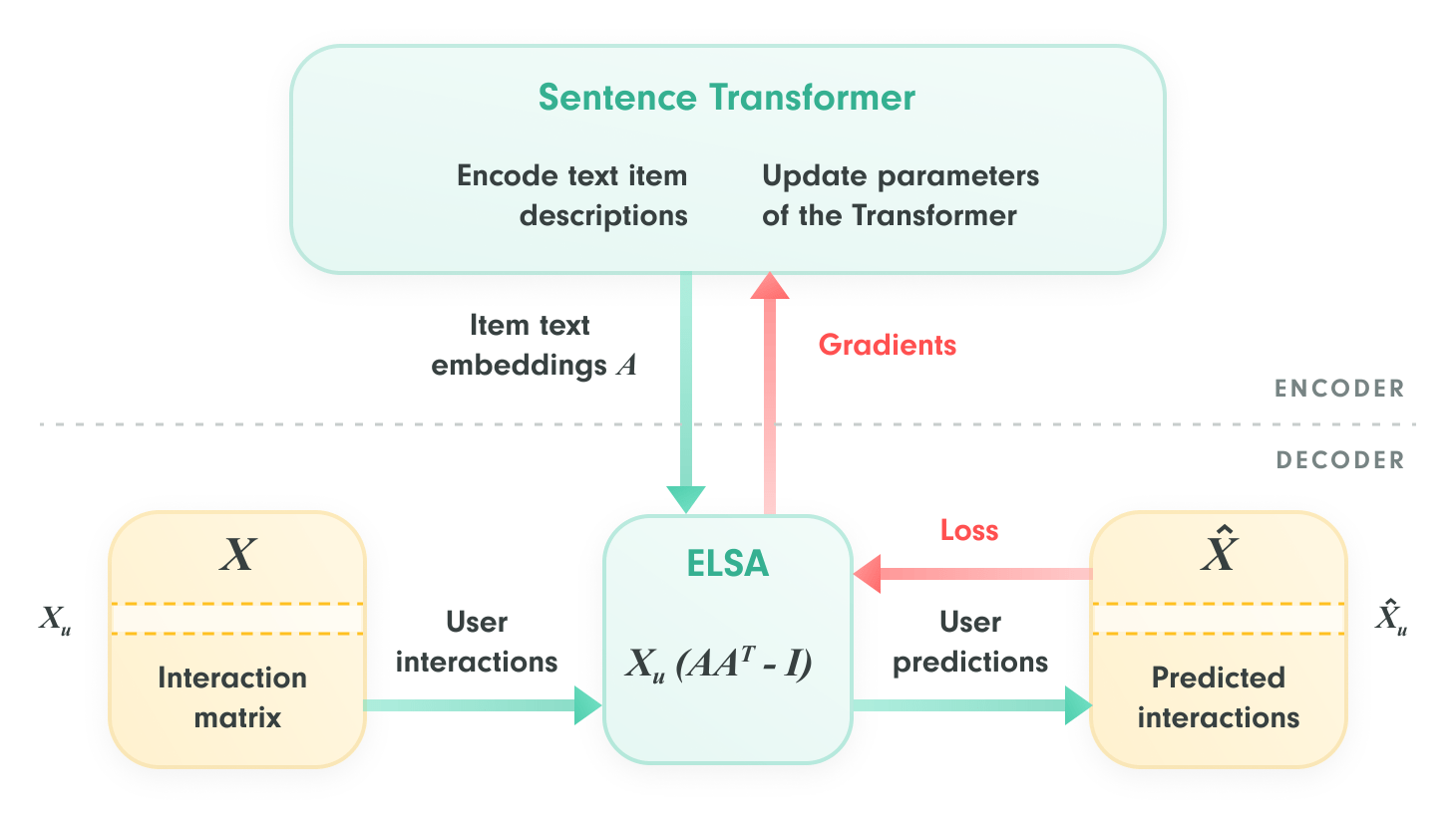 - Interaction Data Knowledge Transfer with ELSA: beeFormer uses ELSA, a scalable linear shallow autoencoder, to refine these vectors based on real user interactions. This step injects the behavioral knowledge often missed by semantic-only approaches, allowing the model to better understand actual user preferences at scale.