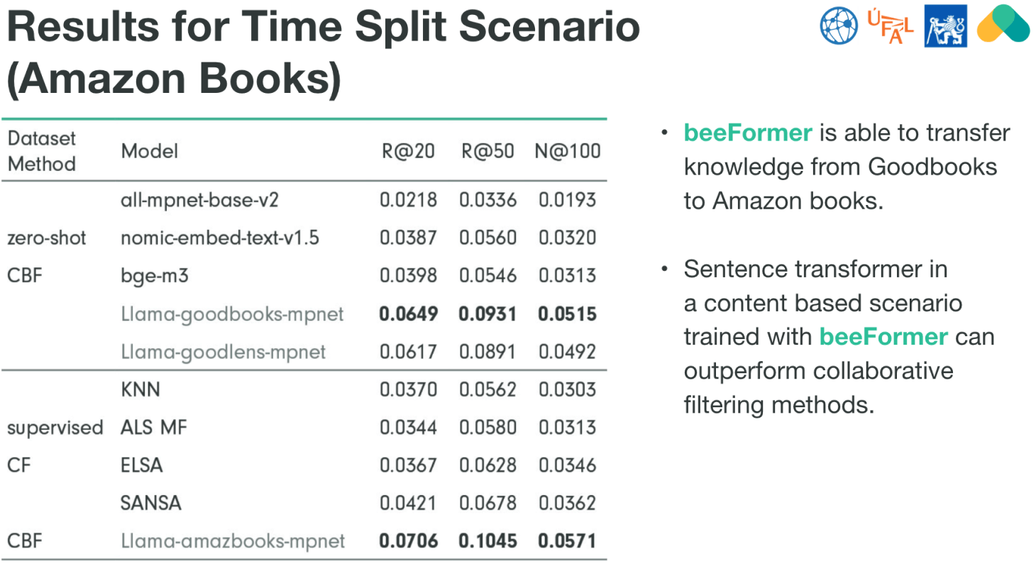 In this scenario, the model is trained on older interactions and tested on newer ones. It mimics a real-world situation where recommendations need to be made based on historical data for new events or items that appear over time. In the Time-Split setup, both traditional collaborative filtering (CF) models and beeFormer-trained models were compared, with the latter showing superior results.The Amazon Books dataset was sorted by timestamp, and the last 20% of interactions were used as the test set, with the remaining 80% used for training and validation. This way, the model must make recommendations for new books based on older user interactions.