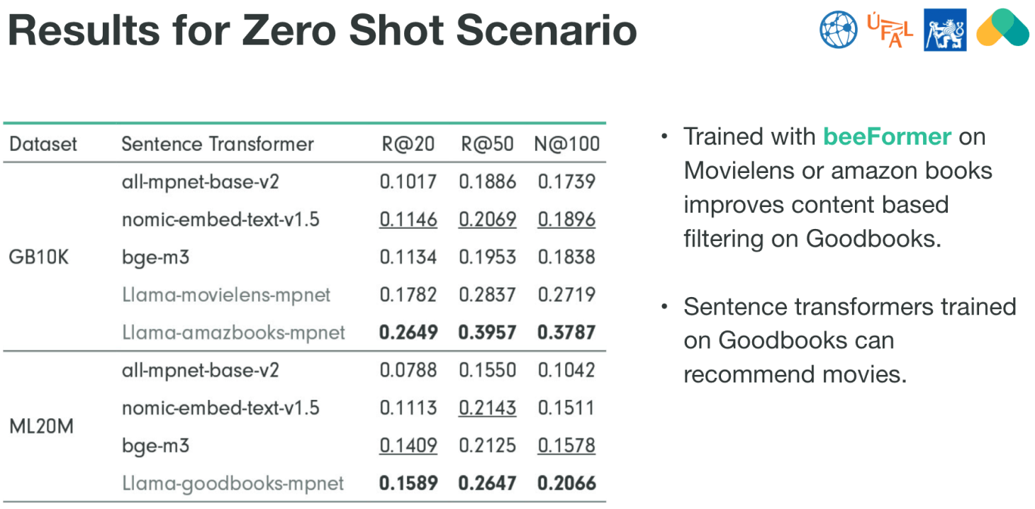 - This result shows that beeFormer, which trained on a different dataset (Amazon Books), successfully transfers its knowledge to recommend items from the Goodbooks dataset. This transfer learning improves content-based filtering on Goodbooks compared to other models.