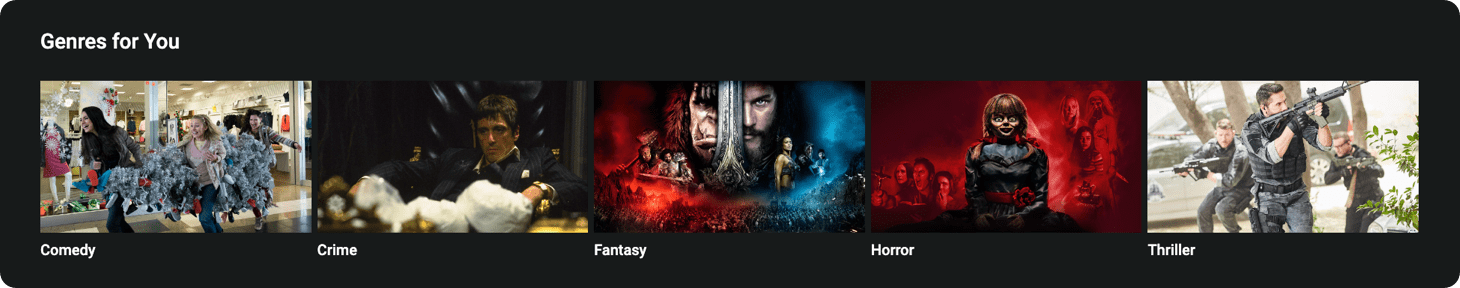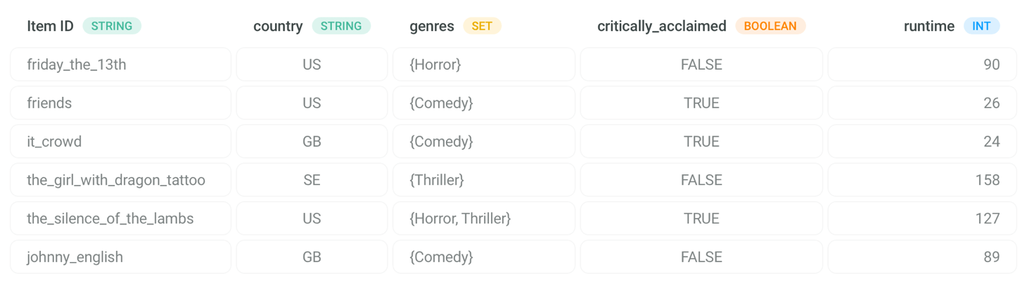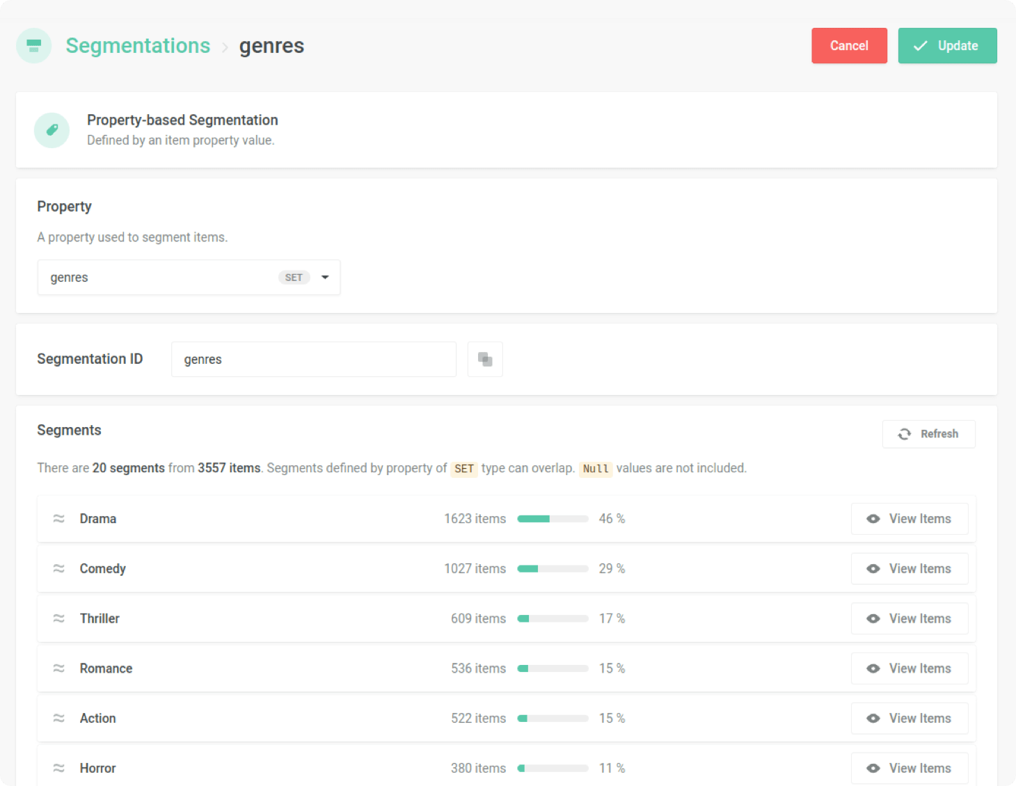Item Segments automatically appear and disappear on the fly along with changes in the Item catalog. Additionally, a single Item may (or may not) be a part of multiple Segments within the same Segmentation (e.g. movie with multiple genres).