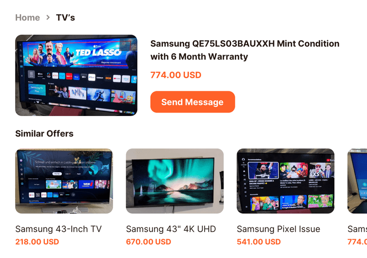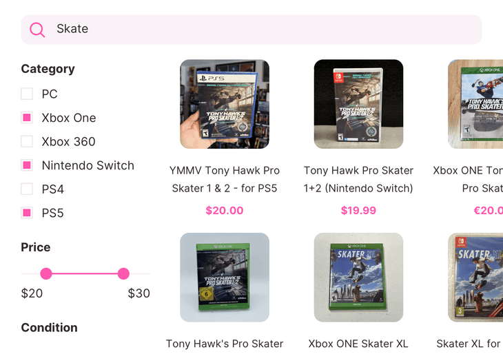 Show offers based on individual search criteria like category, condition, location, or any other specifics from your catalog.