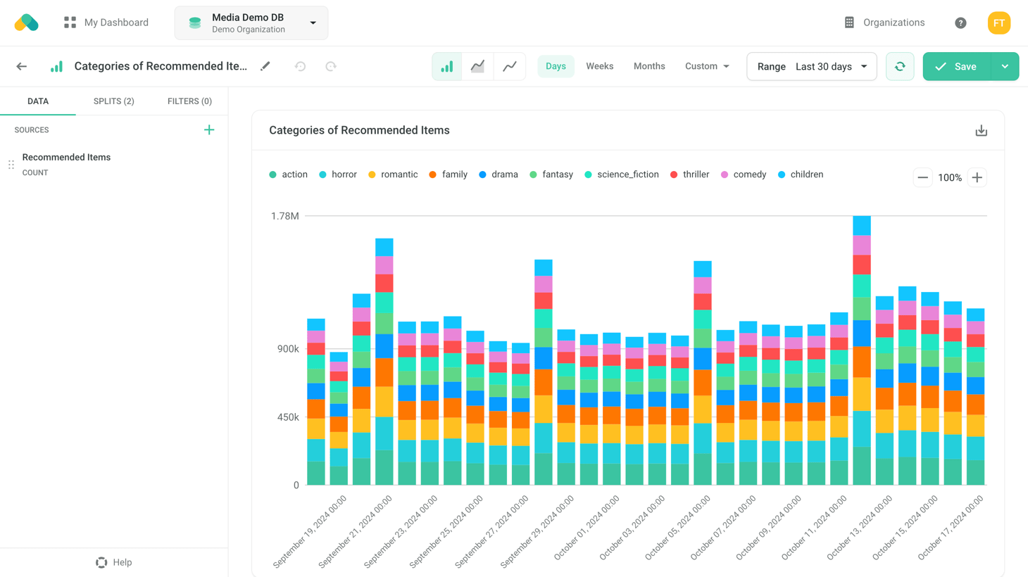 Unlock the power of data with Real-Time Analytics & Insights. The Insights section within the Admin UI provides a range of predefined and fully customizable reports, allowing you to monitor how users engage with recommendations and your platform. This transparency enables close tracking of the recommender's performance, user engagement metrics, and organic interactions.