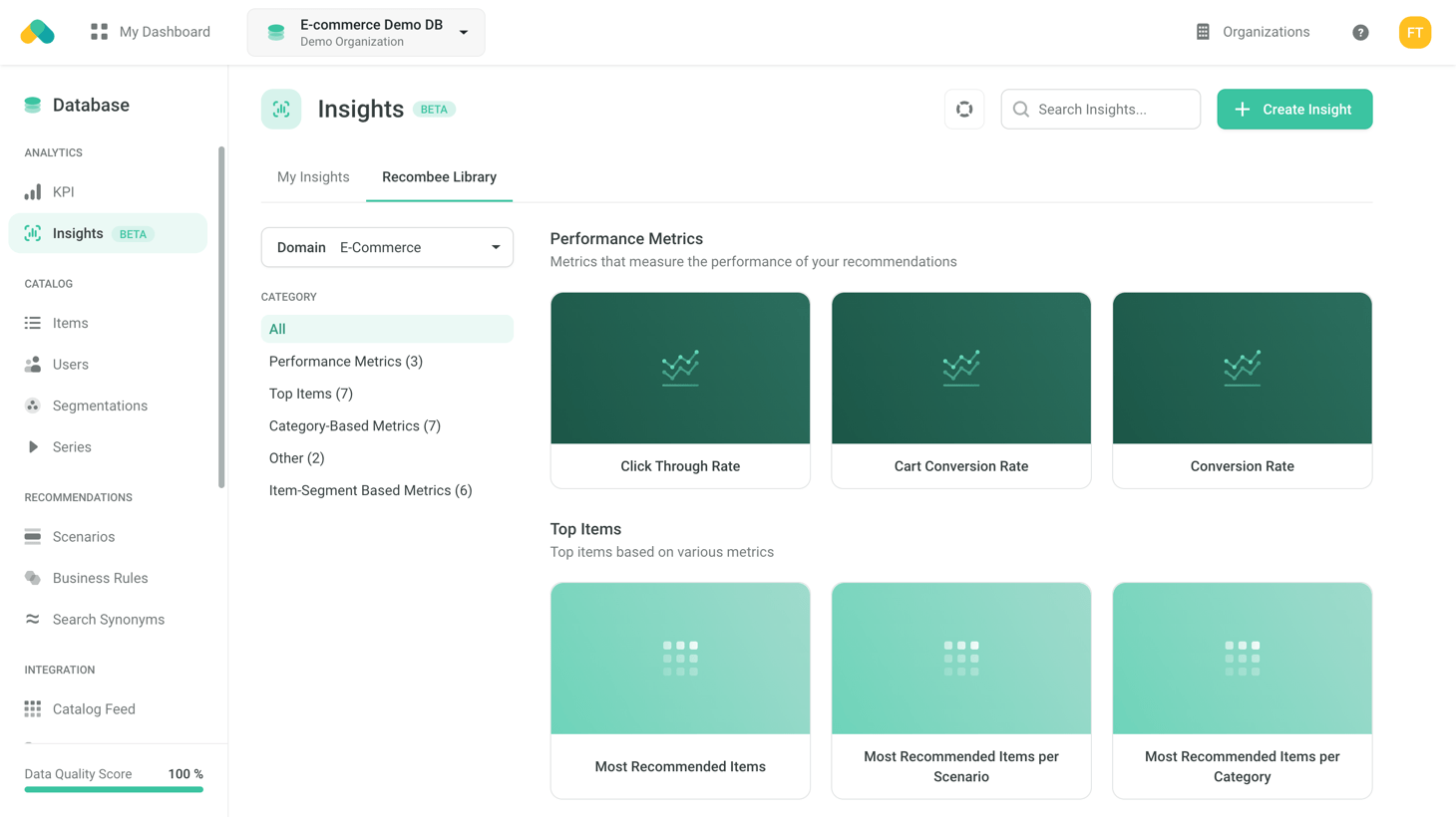 In harmony with Recombee's robust customization features, the Insights module empowers you to focus on your unique KPIs, enabling informed and strategic decision-making.