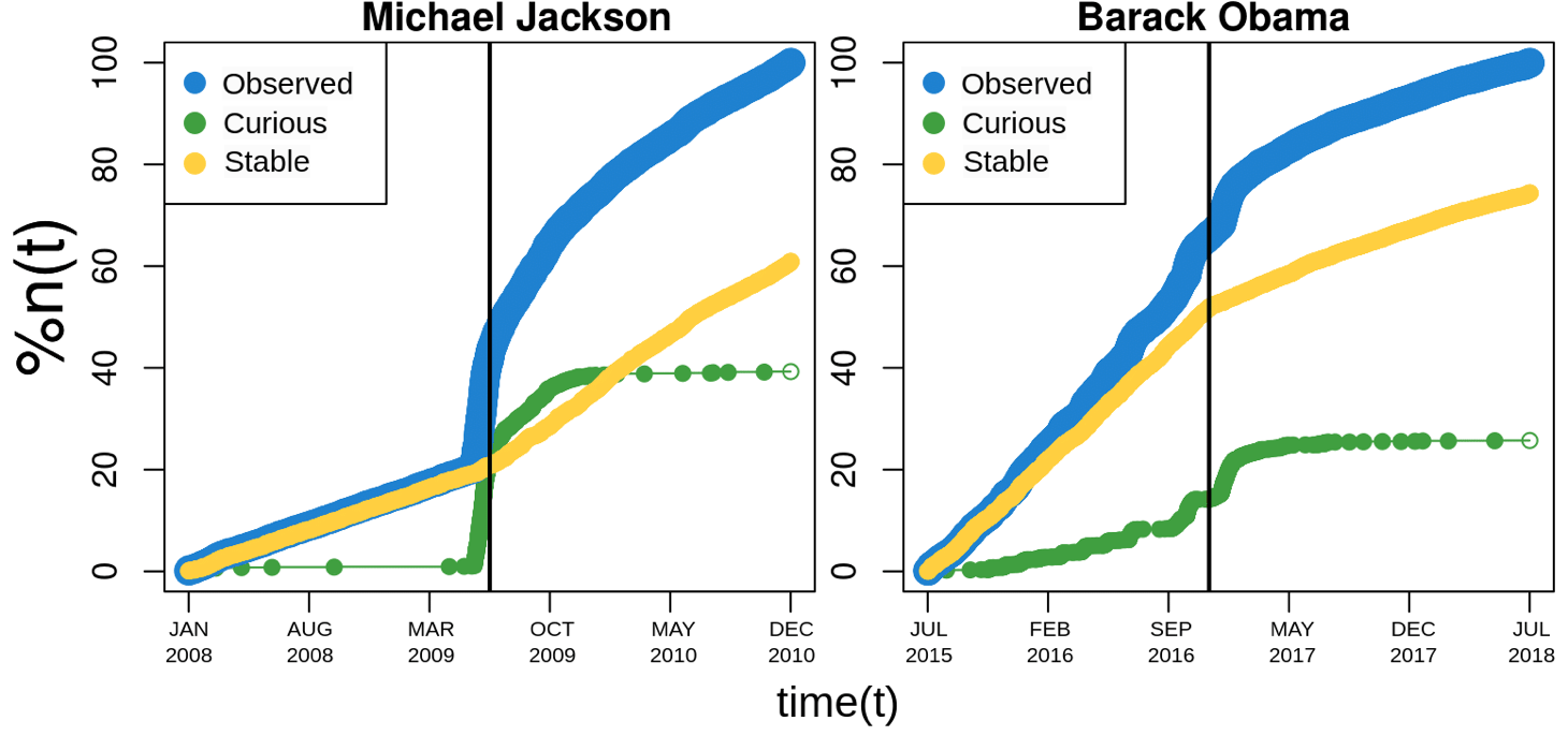Another significant challenge arises from the potential for the stable audience to modify its typical behavior in response to bursts or external events. For instance, the unexpected death of Michael Jackson in June 2009 triggered a surge in media and web activity, leading to increased music sales, video views, and posts discussing him. During this period, both existing and new fans engaged with Jackson's work, transforming him into an enduring musical icon. This behavior is illustrated in the left-hand side of the figure above, where the blue line represents the cumulative web activity associated with Michael Jackson's YouTube searches by an American audience. Initially, it displayed a relatively constant growth rate until his death (vertical black line), followed by a sudden spike in interest. Over time, the blue line returned to a consistent growth rate.
