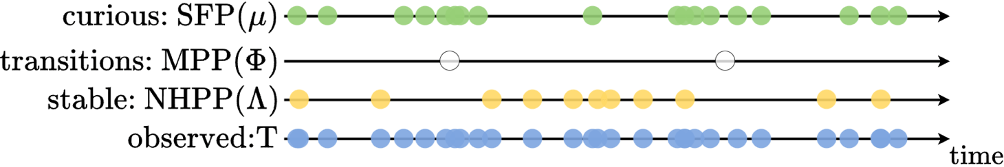 More formally, our model is able to flexibly incorporate dependencies between two hidden and underlying point processes involving the stable fanbase and the curious audience. Therefore, BPoP is capable of disentangling the observed audience (interactions, represented by blue dots) into two different stochastic point processes: one representing the curious audience (green) and another one the stable audience (yellow dots). The transitions of the stable audience (white dots), which we never observe, are influenced by the bursts observed in the curious audience. For that, we assume a generative process where we can define the parameters of the models and treat the labels of the observed points as latent variables, enabling recovery of the parameters with the traditional EM (Expectation Maximization) Algorithm. For detailed derivation, we refer to our paper, which may be more interesting to a technical audience. We show that BPoP mimics the bursts of events seen in real data and is also able to efficiently capture the time-varying background rates that realistically represent the fan base.