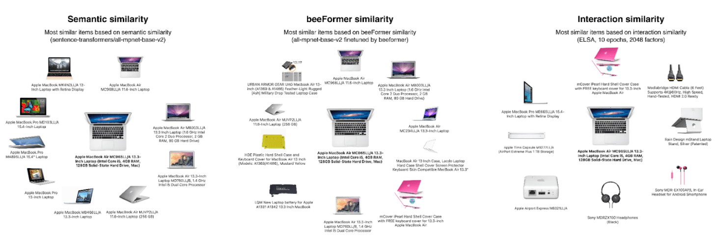 On the left, you can see most similar products to Apple macbook (pure content based similarity). On the right, you can see most similar products based on ELSA collaborative filtering. In the middle, most similar items are based on beeFormer training. Text based semantic similarity is clearly combined with interaction similarity. Note that interactions are not used at all during inference of the model making it applicable to pure cold start scenarios.
