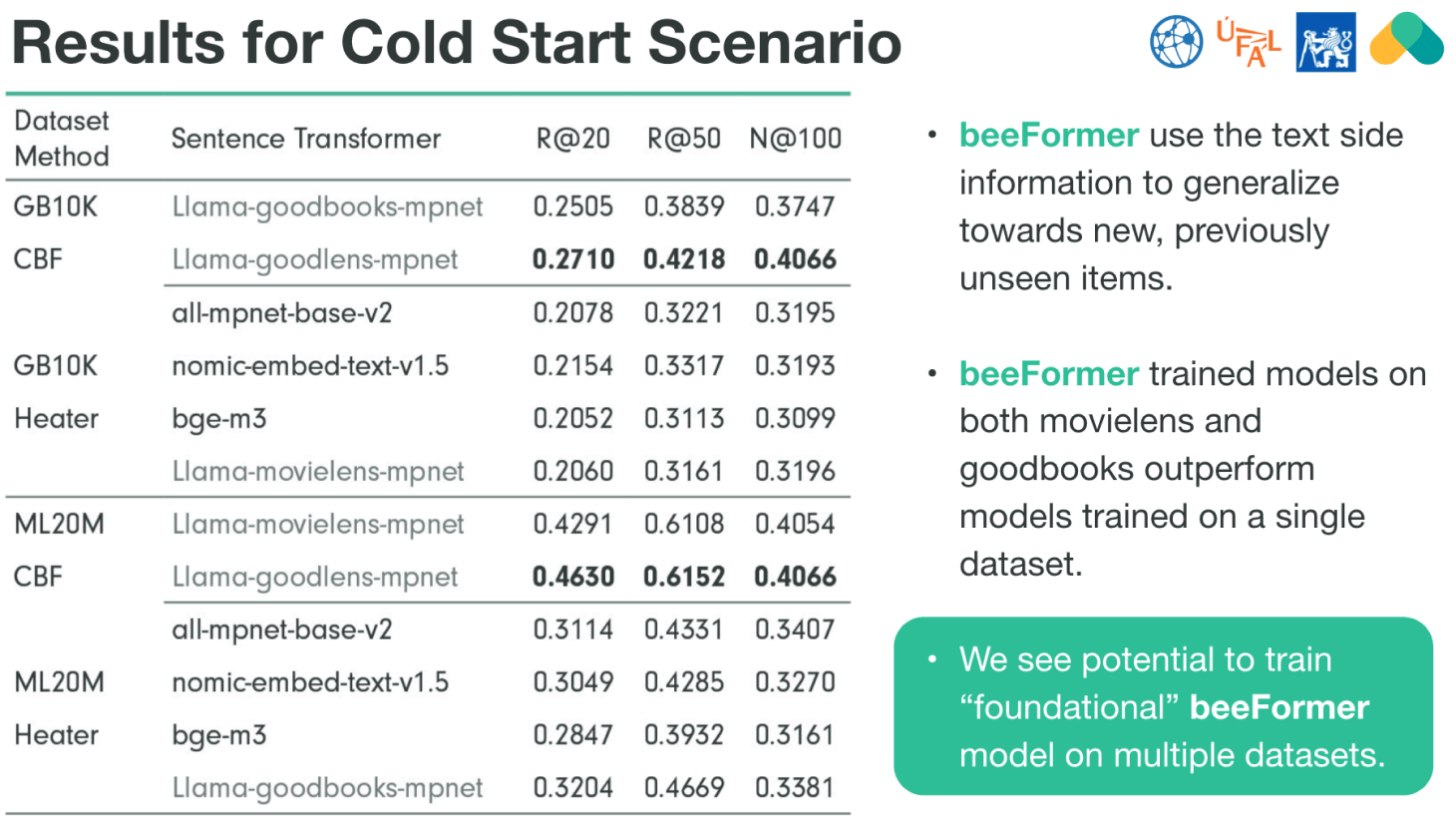 Furthermore, in cold-start situations where new items or users are introduced with limited interaction data, beeFormer excels by utilizing foundational knowledge from multiple datasets, making it a valuable tool for a wide range of industries and applications. The success of models like Llama-goodlens-mpnet across different domains suggests a promising future for building universal, foundational recommender systems. With further development and expansion into multi-modal datasets, beeFormer could become a cornerstone of modern recommendation technology, delivering highly personalized and accurate recommendations, even in the most data-sparse environments.