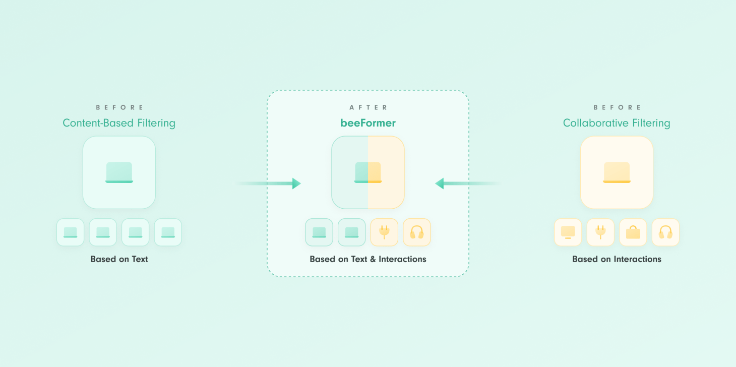 beeFormer is an innovative approach designed to solve this challenge by connecting two types of information: what the items are about (semantic similarity) and how users have interacted with them in the past (interaction similarity). By combining these perspectives, beeFormer makes more accurate recommendations, even in situations where data is limited. Let's take a closer look at how beeFormer works and why it has the potential to transform content recommendations.