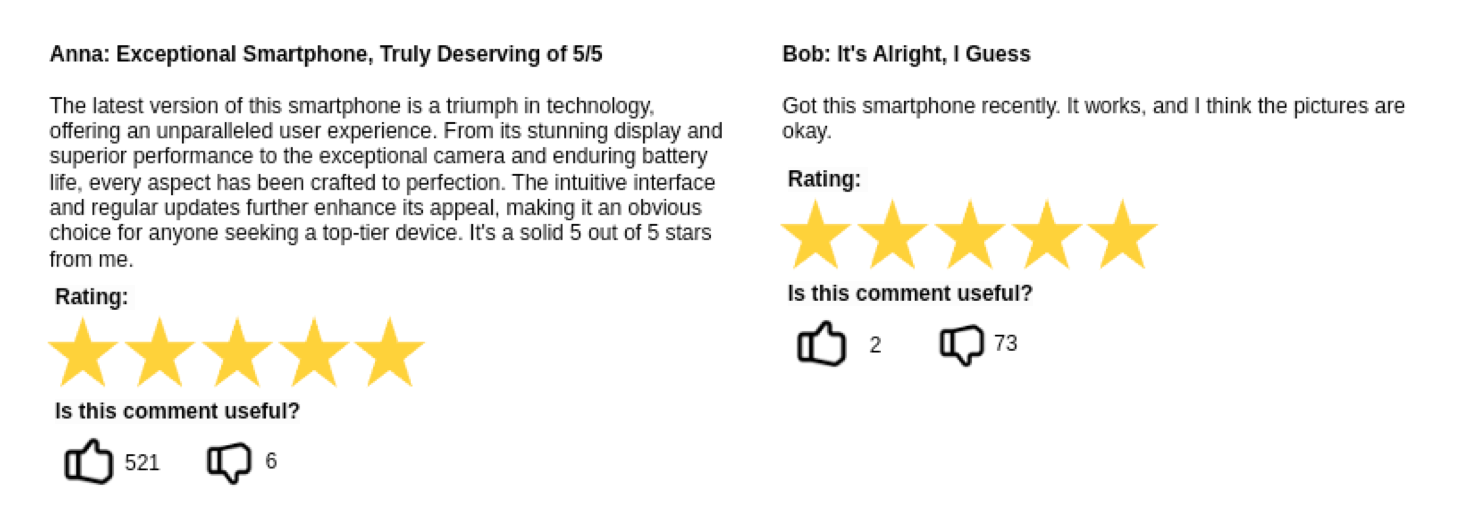 Picture this: you're on the hunt for the perfect new smartphone, browsing through your favourite online electronics store. The online store’s recommendation engine pops up with what it thinks could be your possible next gadget love. You narrow down your options and, to ensure you're making the right choice, you dive into the reviews. Then you find the two reviews below, both awarded five out of five stars for the same smartphone: