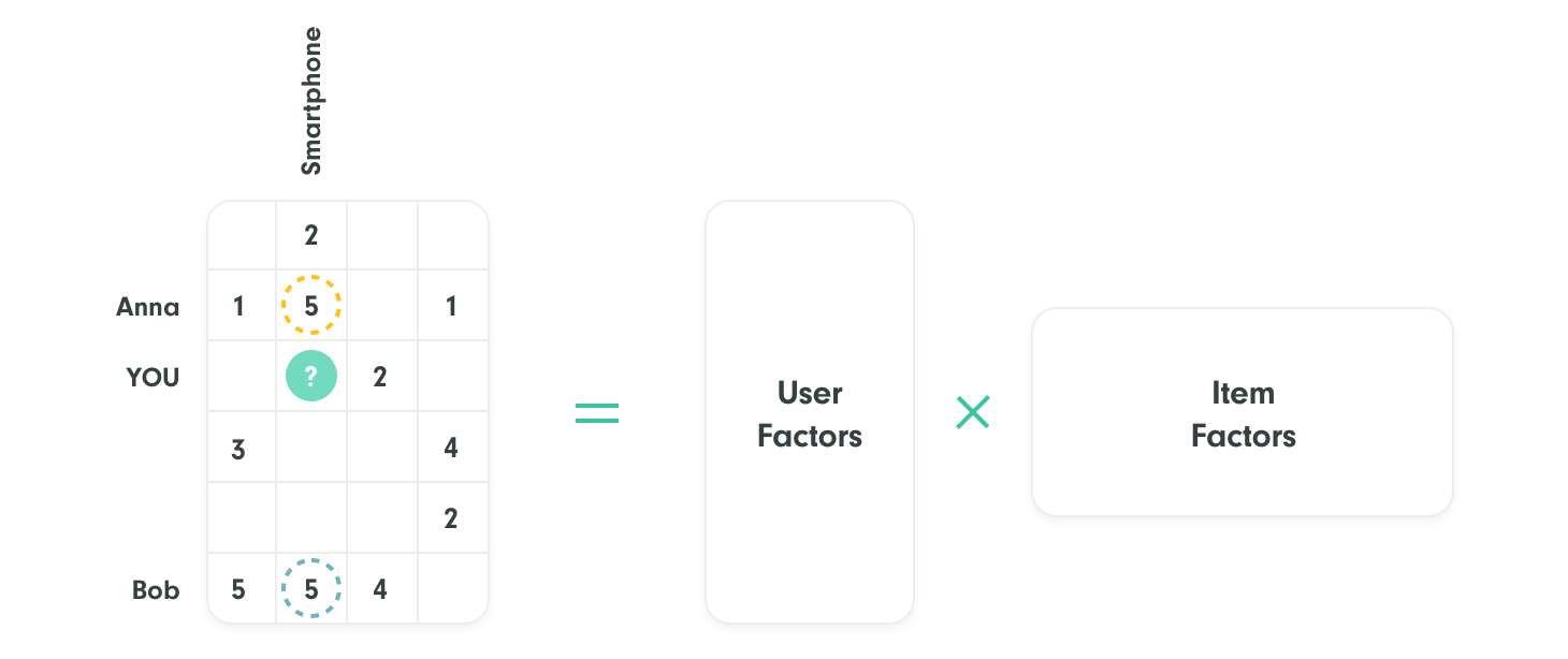 Although MF recommenders are often efficient and accurate, they are highly dependent on the quality of the users' feedback. On the one hand, clear and consistent feedback supports the algorithm's ability to filter collaborative behavior. Noisy or anomalous feedback, on the other hand, can induce the learning method to misinterpret users' preferences, potentially leading to suboptimal recommendations. Since users frequently perceive rating as a tedious process, certain inconsistencies in the data are unavoidable. In MF methods this type of vulnerability to noise is especially complex: the predictions for all of the users are related to each other, and strong noise in one user (or item) can influence and propagate through the predictions of the entire model. However, classic MF methods do not adapt to the noise in user-item ratings or factor the uncertainty into the model. Even the simple fact that some users are (or less) confident in their judgement is typically neglected. By giving the same importance to the ratings of all users (both normal and anomalous), the learning method can be notably affected if a substantial number of users provide evidently erratic feedback. Crucially, unlike other machine learning methods, inaccurate ratings and noise in recommender systems can be highly structured in their dependence on the input. In simpler terms, these systems only look at the numerical rating a user leaves, ignoring any written comments. Even though these comments could offer valuable insights for making better recommendations in the future, they're not taken into account. The factorization of our smartphone example is illustrated in the figure below: