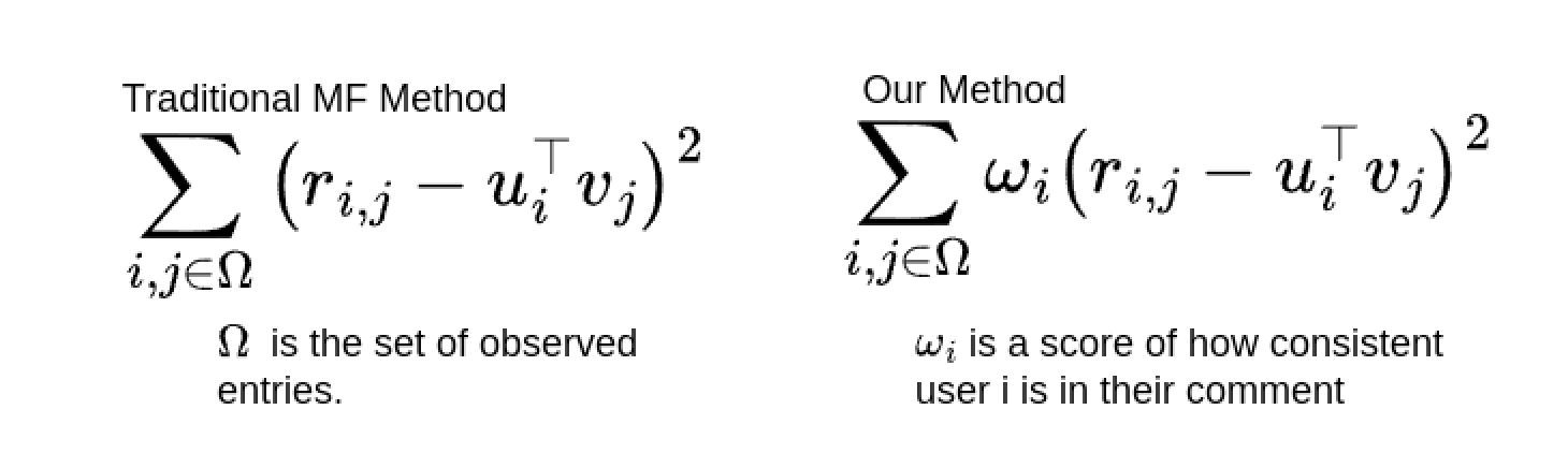 How we do that? We postulate that more comprehensive reviews made by a particular user indicate that he/she/they is meticulous in his/her/their evaluations and thus may consistently generate less noise during the rating process. We reinforce the feedback from such users who appear to demonstrate a higher standard of thoroughness and trustworthiness in the assessment of the items they interact with. To achieve this aim, we construct weights for each user indicating the degree of trustworthiness of their reviews, and use them to re-weight the empirical estimate of the loss function. The weight will be higher if we estimate that their predictions are an accurate reflection of a consistent taste and lower if their rating behaviour appears erratic. However, this does not mean that users deemed the most "trustworthy" must produce ratings which agree with each other, but rather that they are not subject to outside noise not directly related to the user-item combination. In other words, we give more importance to users which consistently gives consistent comments together with their feedback. In a mathematical sense, our loss function differentiate from traditional matrix factorization as the following: